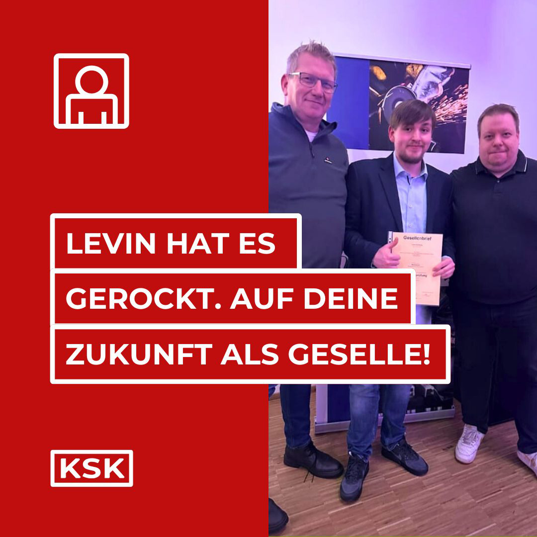 herzlichen Glückwunsch zu dieser großartigen Leistung! Das gesamte KSK-Team freut sich, dich weiterhin als Gesellen in unserem Unternehmen zu wissen und dich auf deinem weiteren beruflichen Weg zu begleiten.